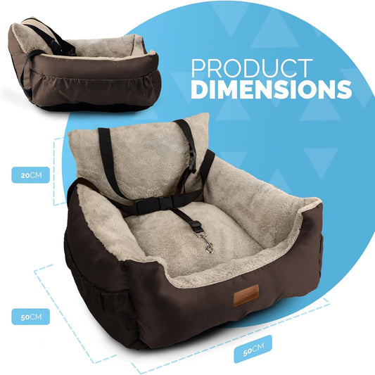 Dog Car Seat (Brown/Beige - 20Kg), Plush & Cosy Pet Car Booster Seat for Small Dogs & Cats with Storage Pocket, Car Dog Bed with Safety Leash, Waterproof Liner & Non-Slip Base,Dog Travel Bed